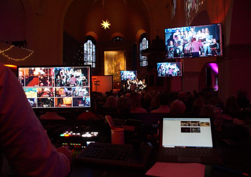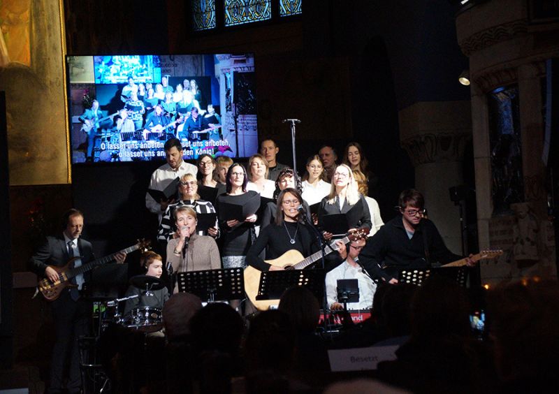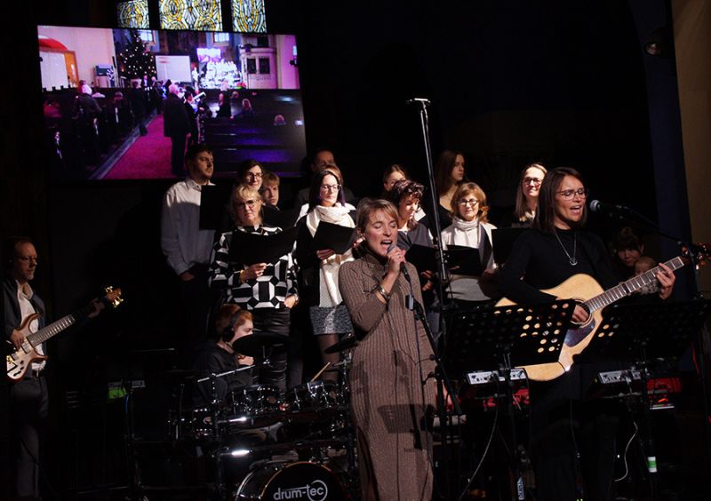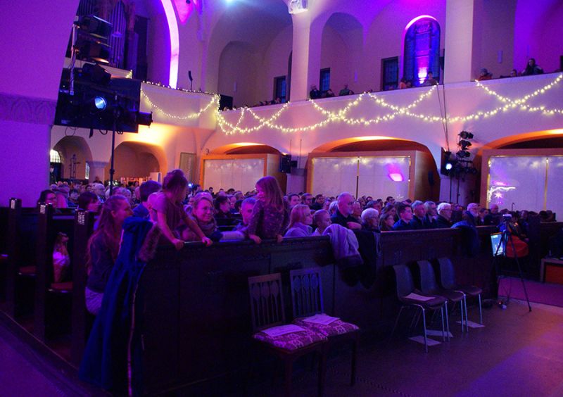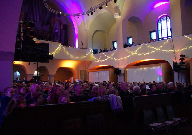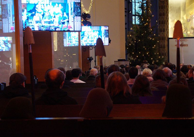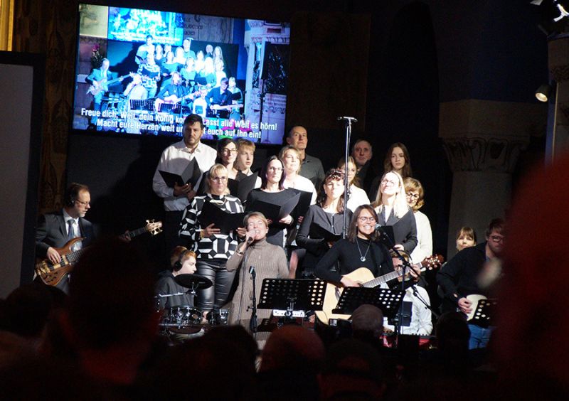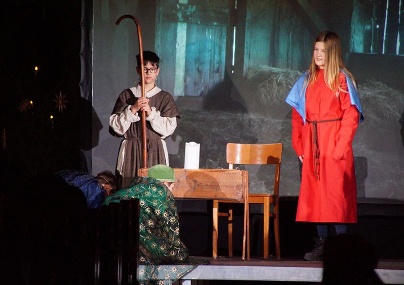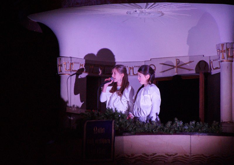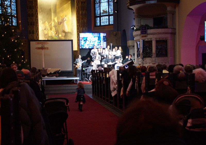 Zum ersten Mal eröffnete ein gemischter Weihnachtschor aus Gemeindemitgliedern den Gottesdienst. Mit viel Freude und Hingabe erfüllten Stimmen und Musik das Kirchenschiff, dass bis auf den letzten Platz gefüllt war, selbst auf der Empore fanden viele Gäste ihren Platz. Damit alle gut sehen konnten, wurde das Krippenspiel per Beamer auch an die Kirchenwand projiziert.