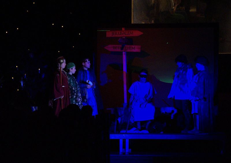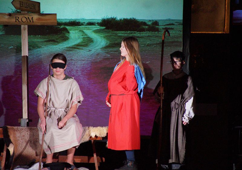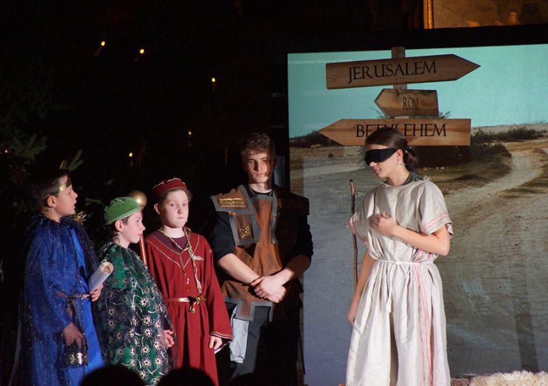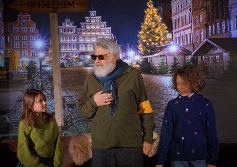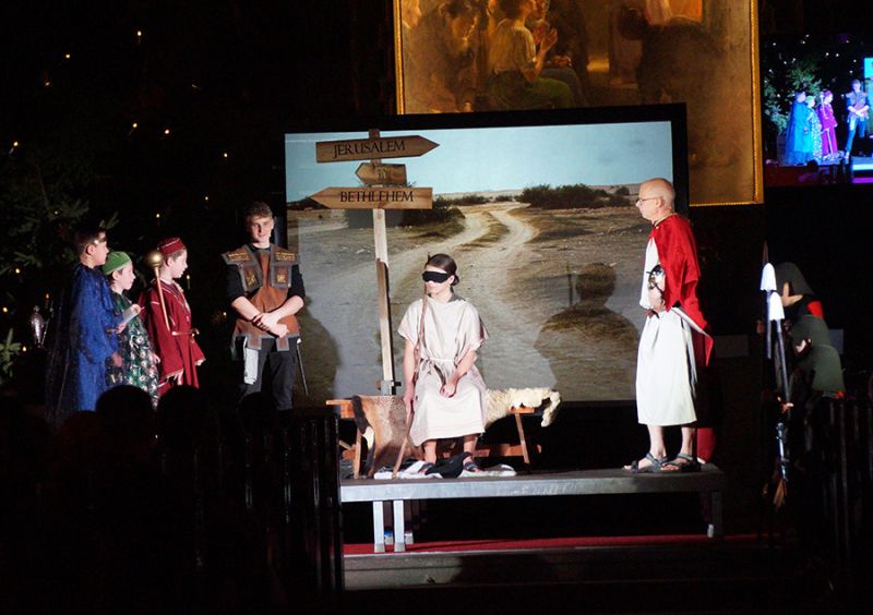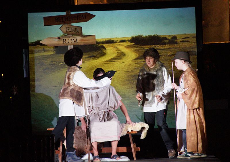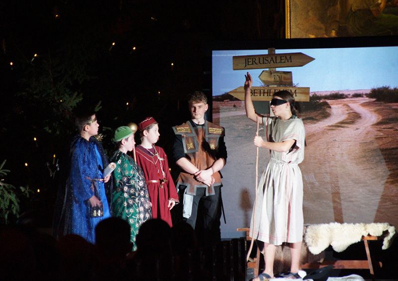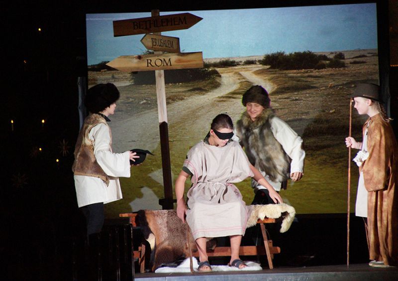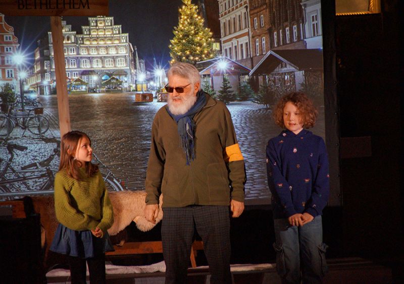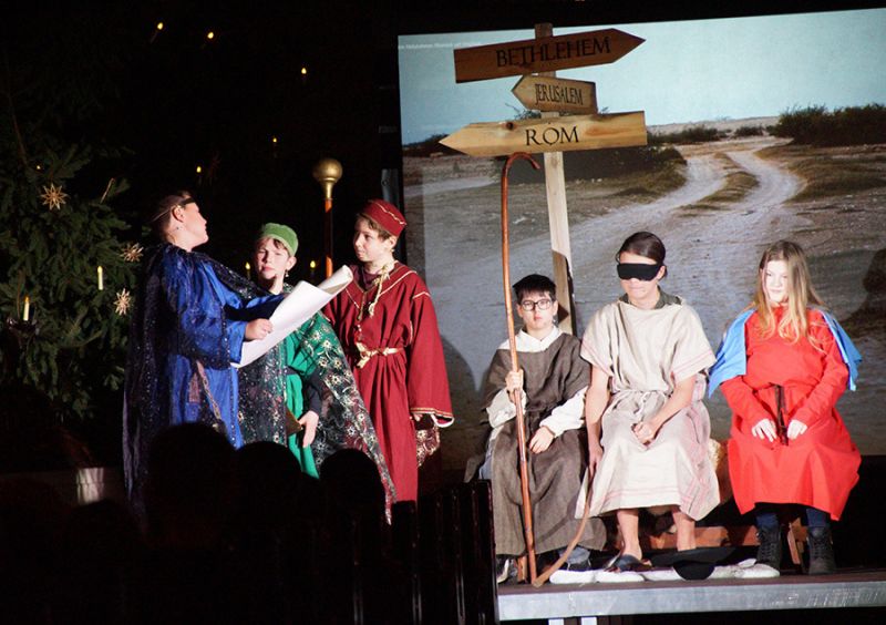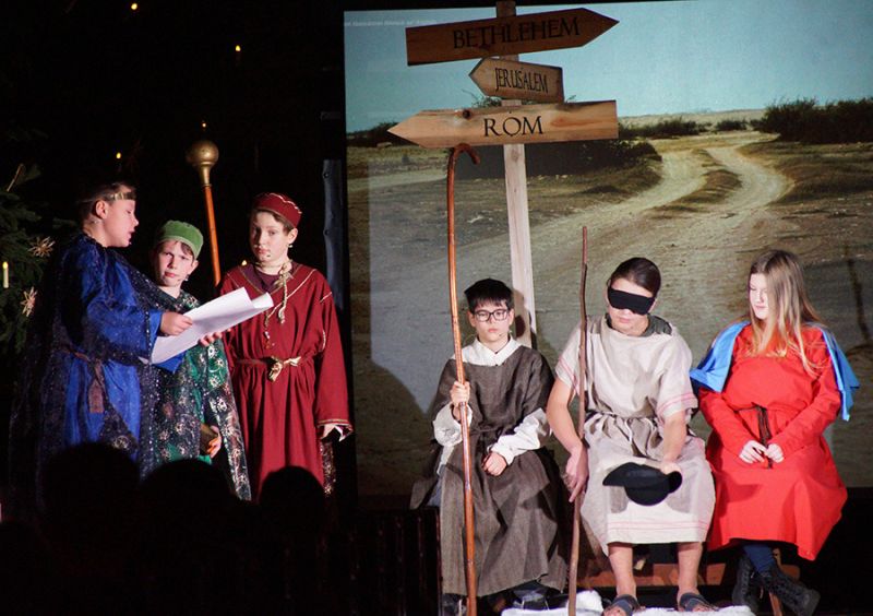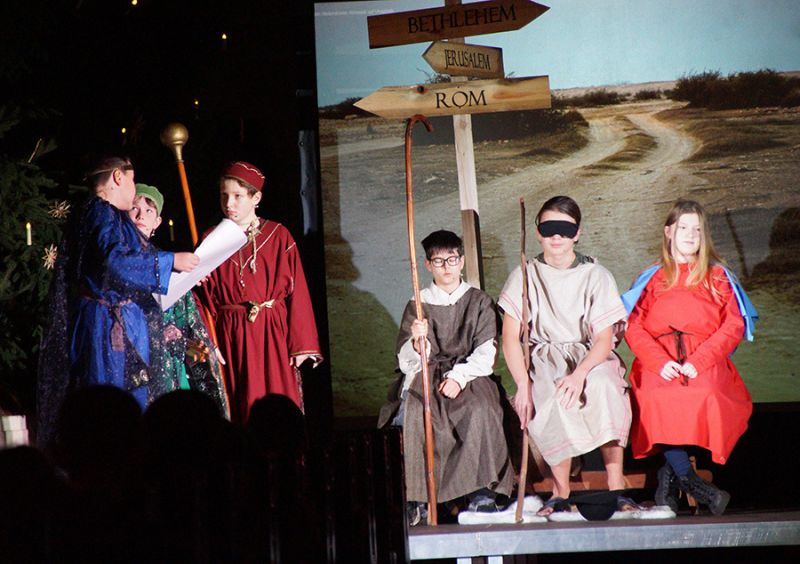 Anschließend folgte ein wunderschönes Verkündigungsspiel, das von einem Kinder-Engelchor begleitet wurde: Ein „blinder“ Großvater erzählte seinen Enkelinnen von einem Krippenspiel, das ihm geholfen hatte, seinen Schmerz über die eigene Blindheit loszulassen. Er berichtete von Samuel, einem blinden Mann, der an einer Wegkreuzung saß und allen den Weg wies, obwohl er ihn selbst nie gesehen hatte, und doch immer wieder zurückgelassen wurde – bis sich schließlich ein Legionär erbarmte und ihn zum Jesuskind nach Bethlehem brachte.