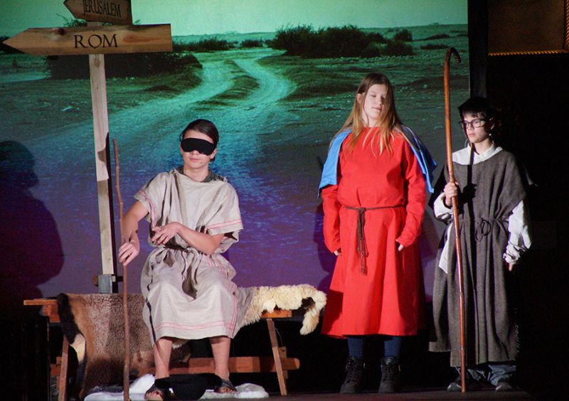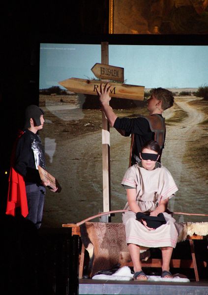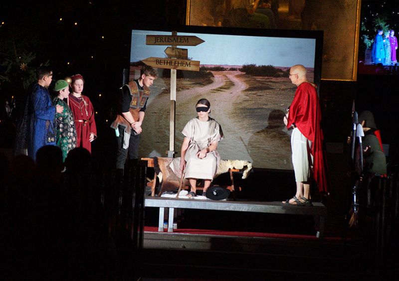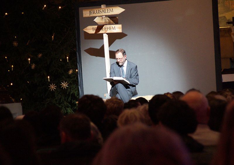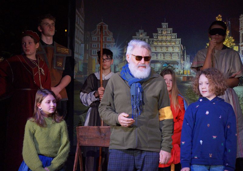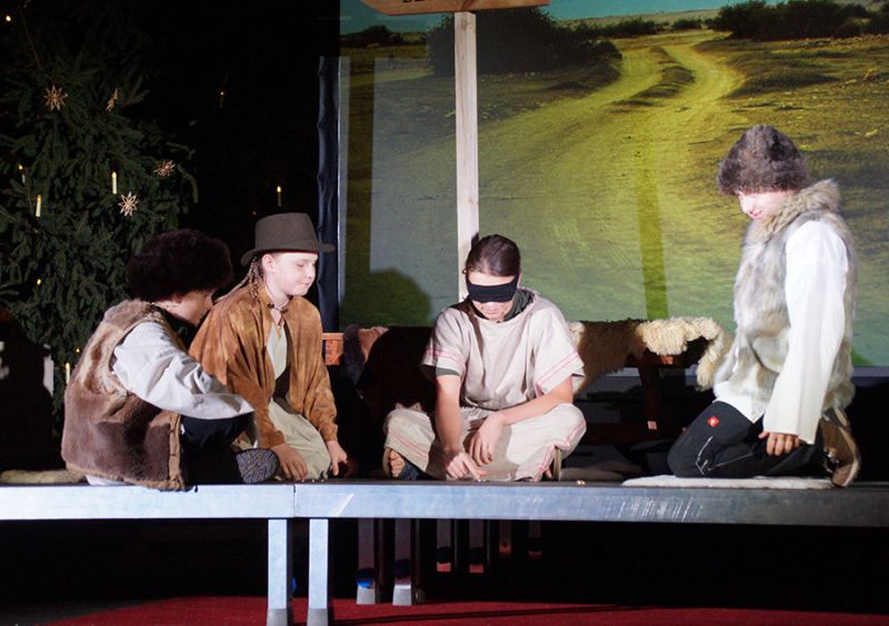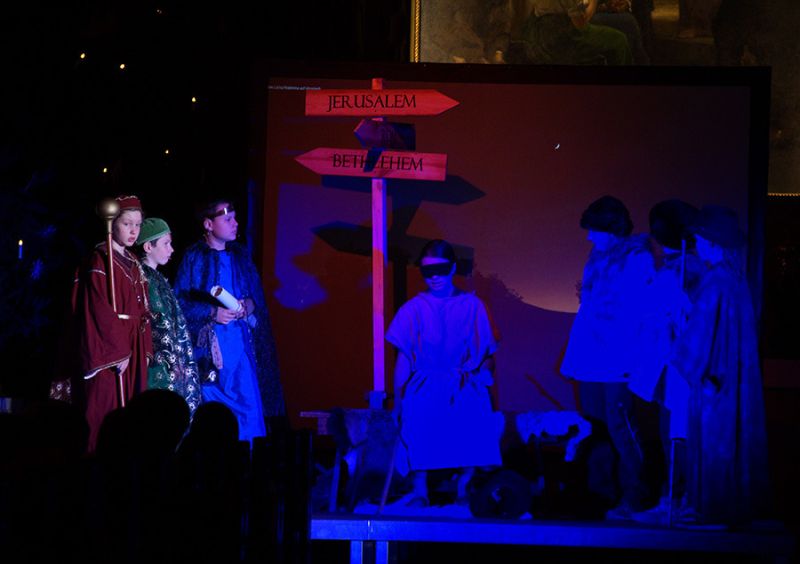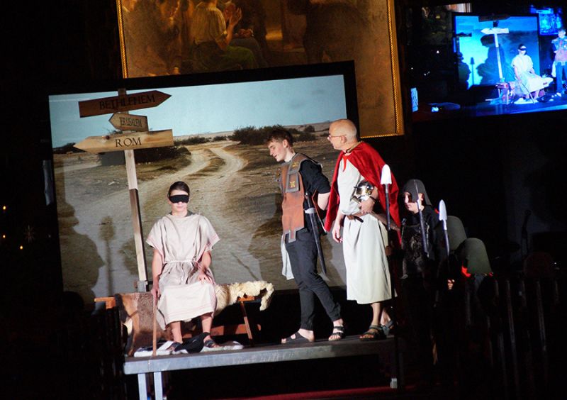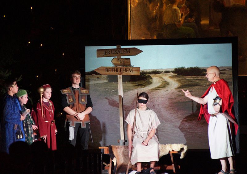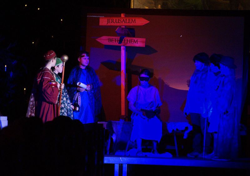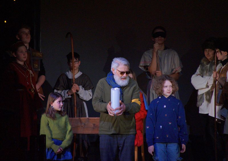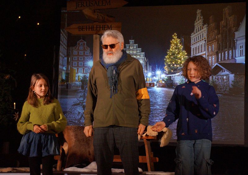 Anschließend folgte ein wunderschönes Verkündigungsspiel, das von einem Kinder-Engelchor begleitet wurde: Ein „blinder“ Großvater erzählte seinen Enkelinnen von einem Krippenspiel, das ihm geholfen hatte, seinen Schmerz über die eigene Blindheit loszulassen. Er berichtete von Samuel, einem blinden Mann, der an einer Wegkreuzung saß und allen den Weg wies, obwohl er ihn selbst nie gesehen hatte, und doch immer wieder zurückgelassen wurde – bis sich schließlich ein Legionär erbarmte und ihn zum Jesuskind nach Bethlehem brachte.