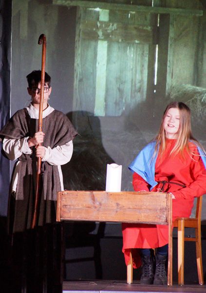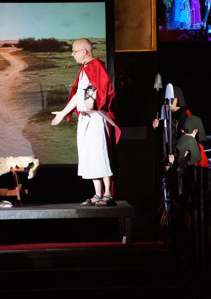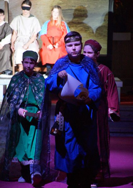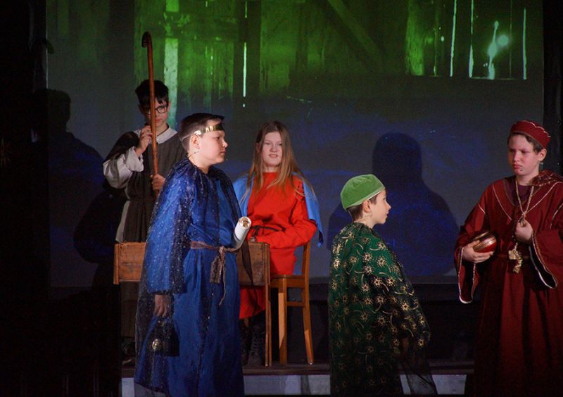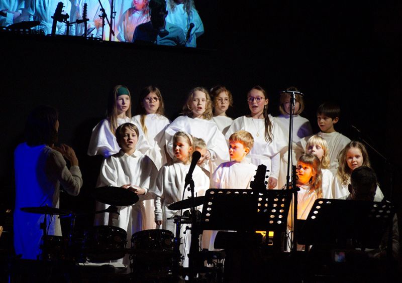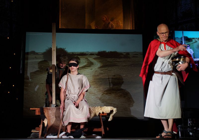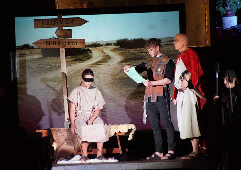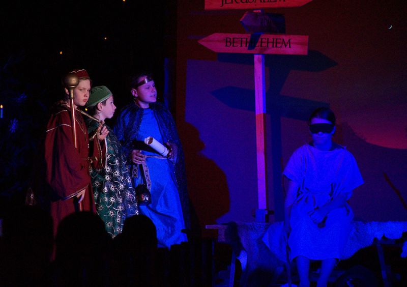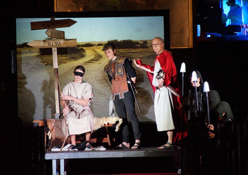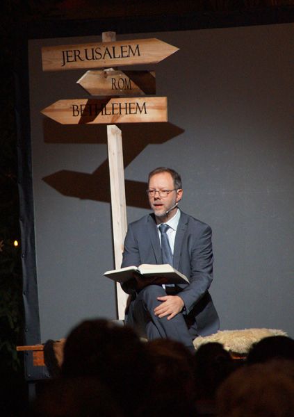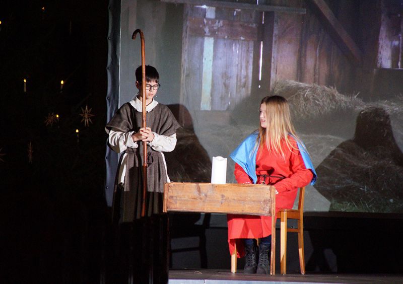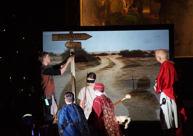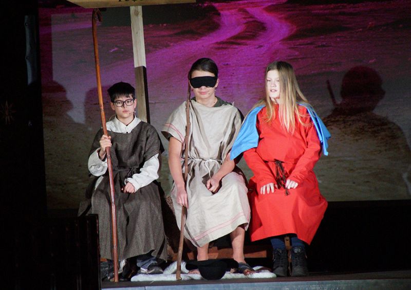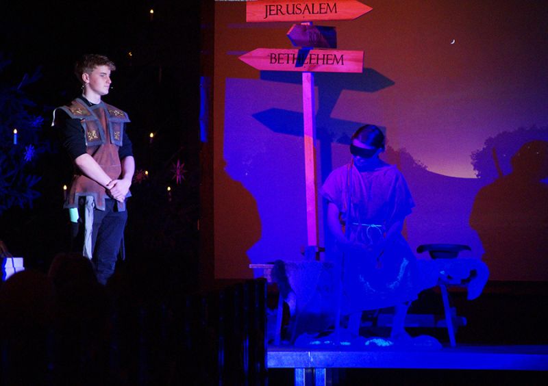 Anschließend folgte ein wunderschönes Verkündigungsspiel, das von einem Kinder-Engelchor begleitet wurde: Ein „blinder“ Großvater erzählte seinen Enkelinnen von einem Krippenspiel, das ihm geholfen hatte, seinen Schmerz über die eigene Blindheit loszulassen. Er berichtete von Samuel, einem blinden Mann, der an einer Wegkreuzung saß und allen den Weg wies, obwohl er ihn selbst nie gesehen hatte, und doch immer wieder zurückgelassen wurde – bis sich schließlich ein Legionär erbarmte und ihn zum Jesuskind nach Bethlehem brachte.